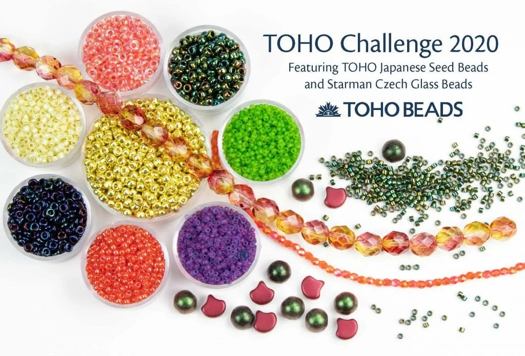 I find that in designing, the more constraints I have, the easier it is to come up with a cohesive design. By constraints I mean things I cannot change about the project, like the particular beads being used, the size and type of project, the difficulty, particular stitches, and other variables that I can narrow down. With Enchanted Lightbloom Headdress, I started with two major constraints: the beads I was to use were already chosen for me, and I knew I wanted to make a mask.The beads were sent to me by Team Toho Beads so that I could participate in their annual design challenge. They put together a palette of beads with vivid hues of green, yellow, salmon, and purple, inspired by colors from a flower garden. I too found that the colors made me think of a flower garden, and decided when I saw the beads that I would go back to my roots (so to speak) and start by making a bunch of beaded flowers.