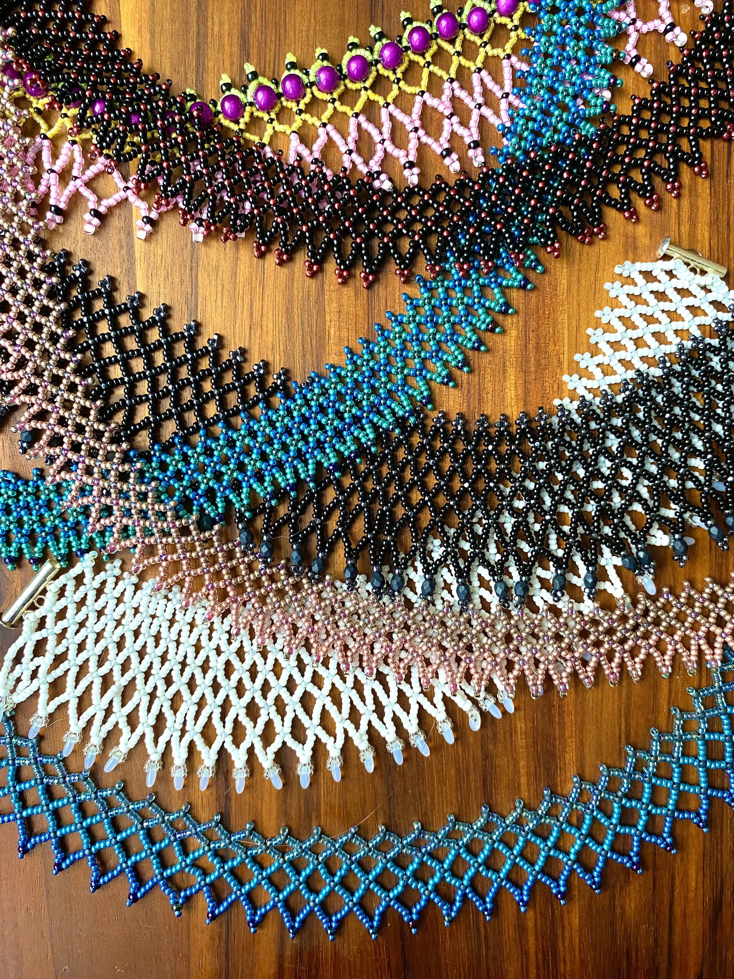 This is my favorite beaded choker! I actually wear these pieces of beaded jewelry more than any other kind because they are so lightweight and casual. They are fast to work up as well, using only netting and anchor stitch! You can vary the color patterning, bead sizes, bead types, number of beads in each net, and number of beads in each row to get different styles.