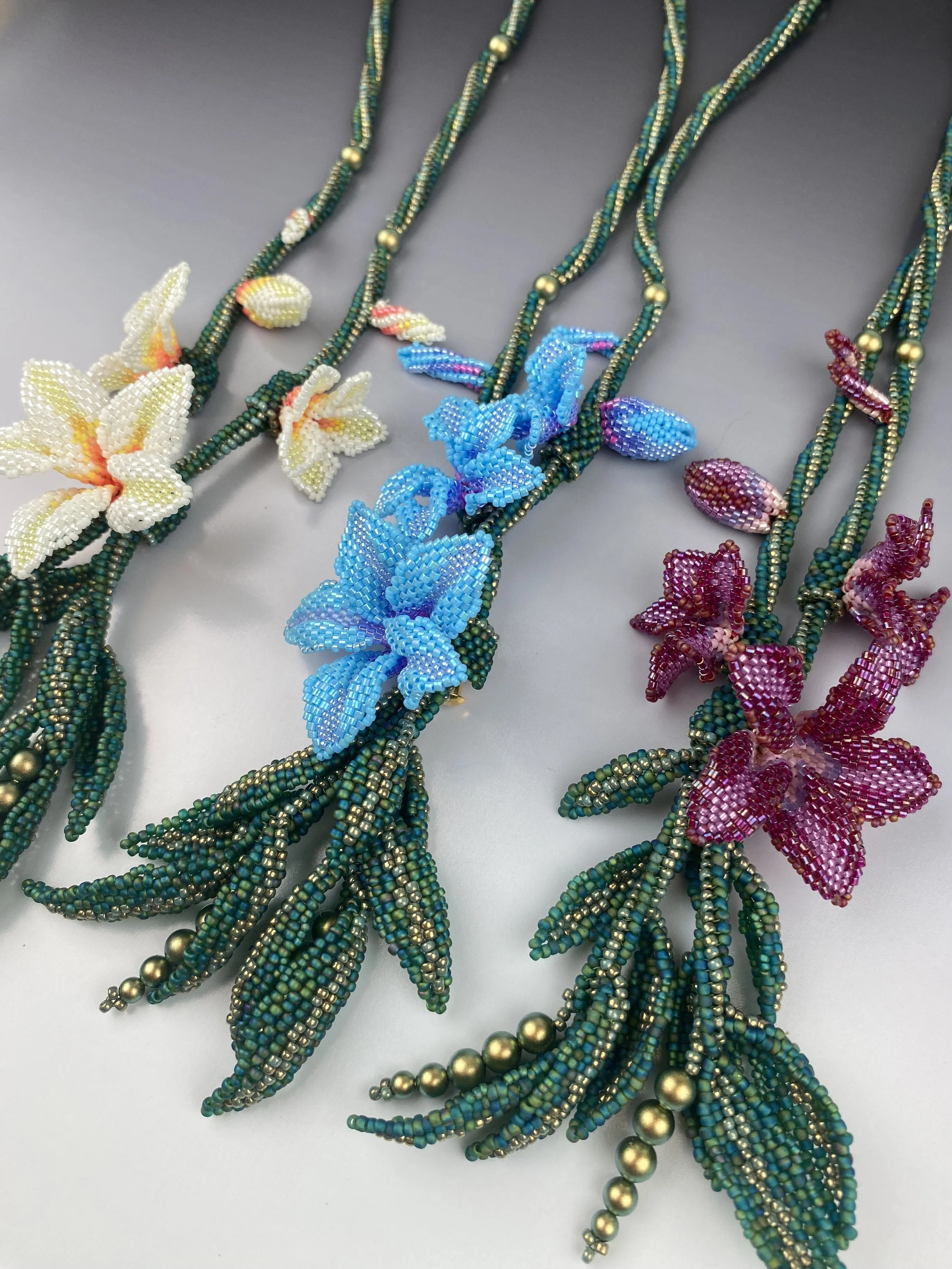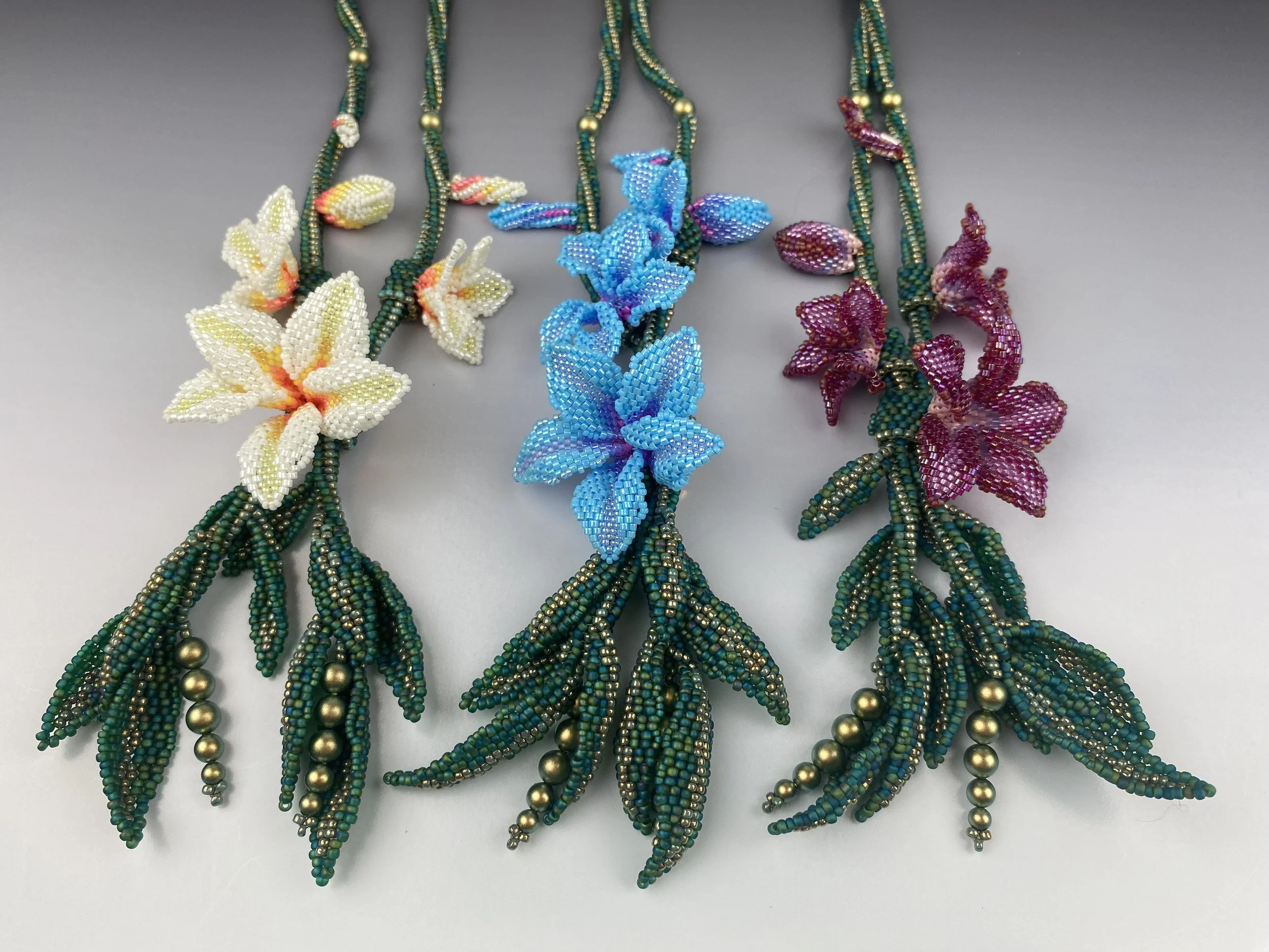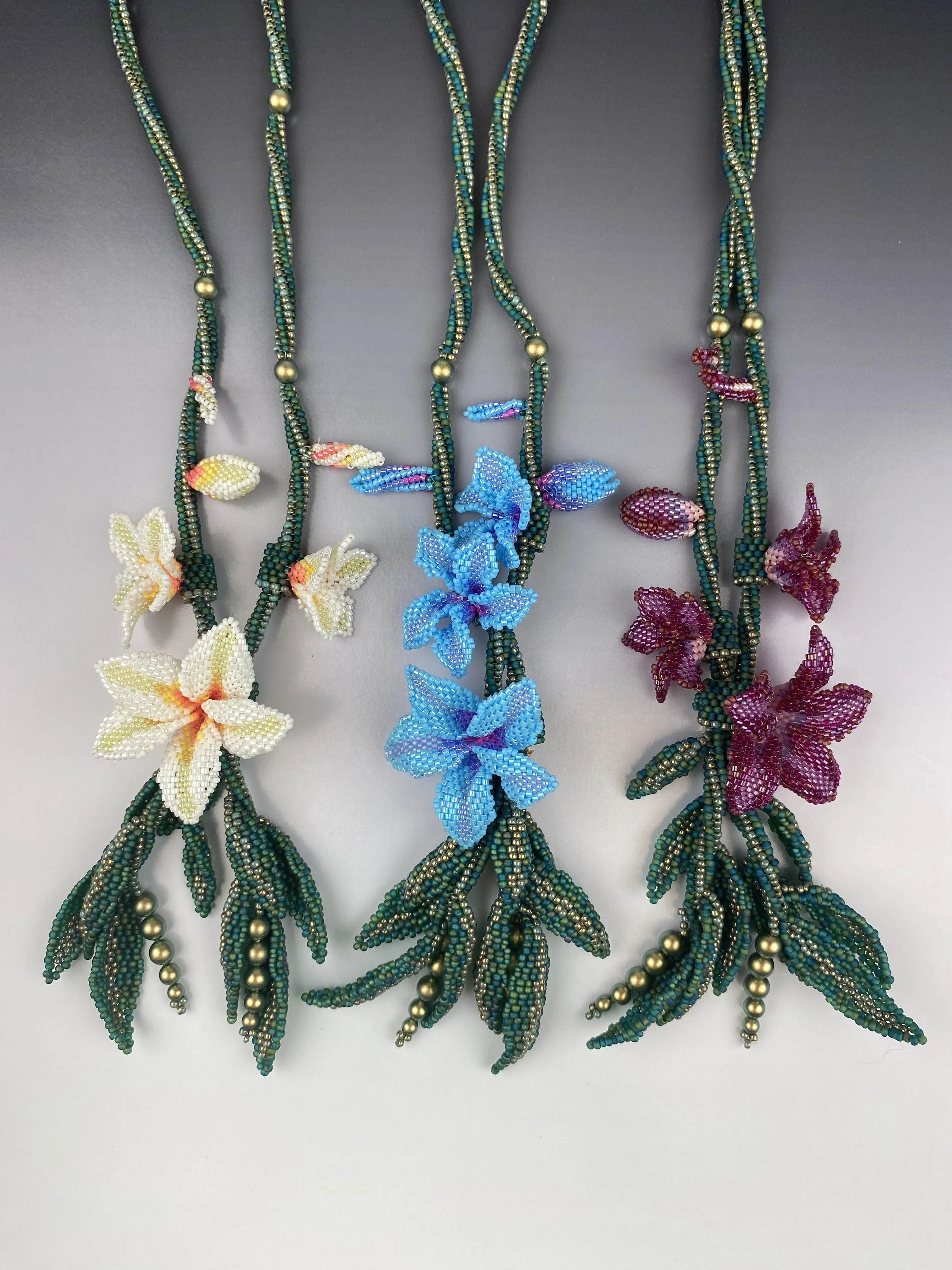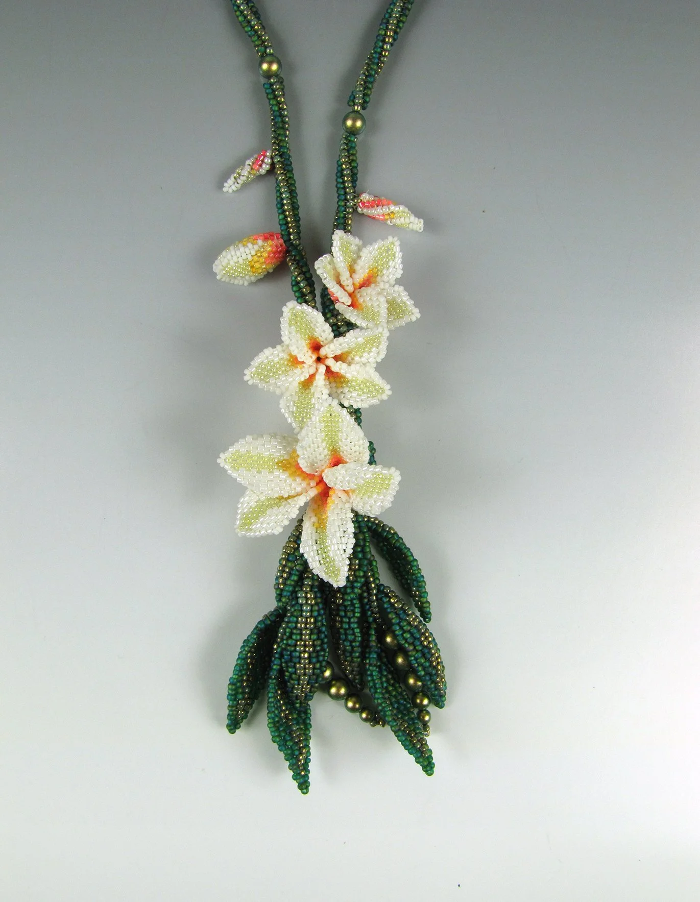 Use peyote stitch to create the life-like ombre-colored petals of the Plumeria flowers in this lariat, inspired by the beautiful native flower and lush green vegetation of Hawaii.