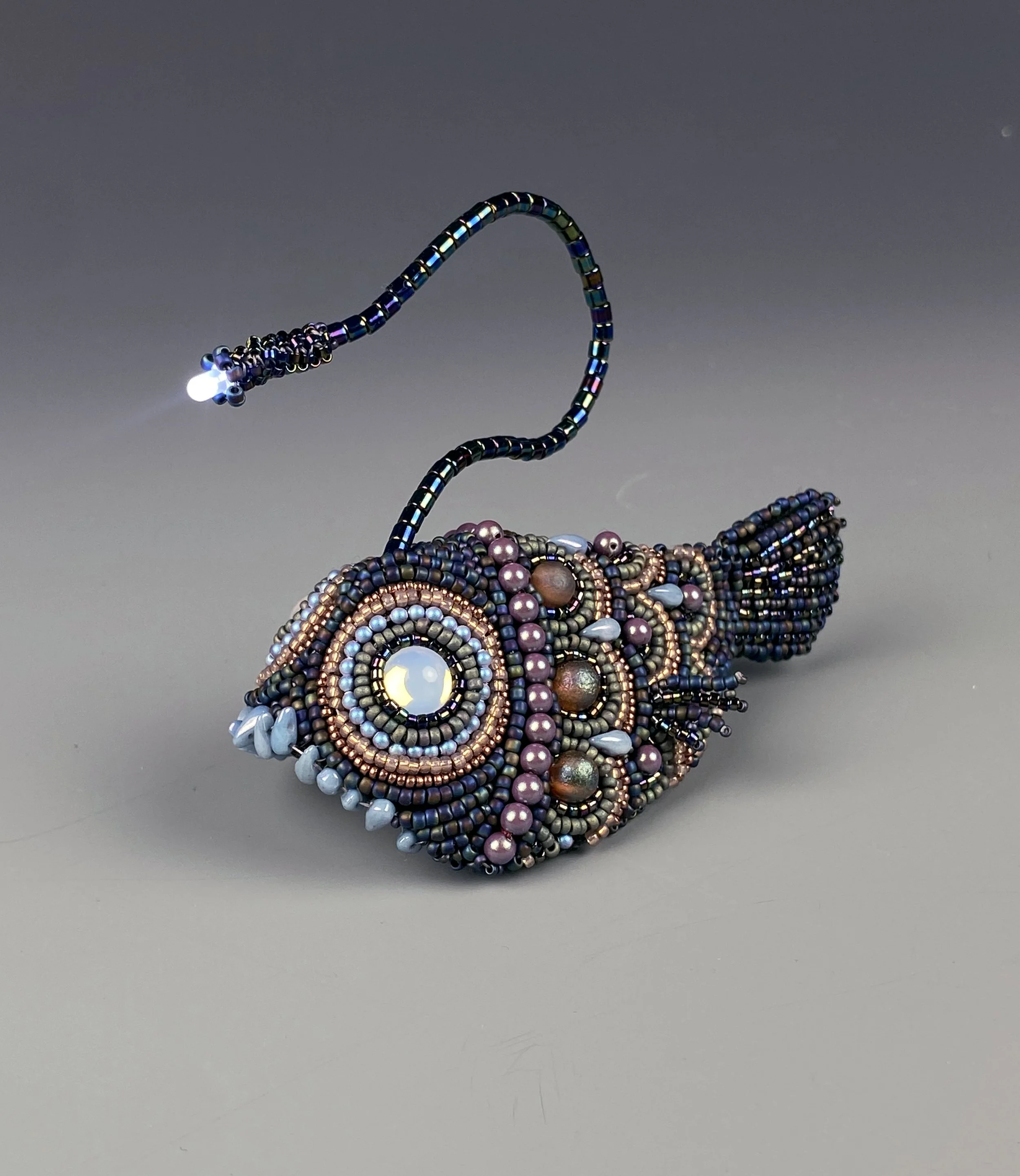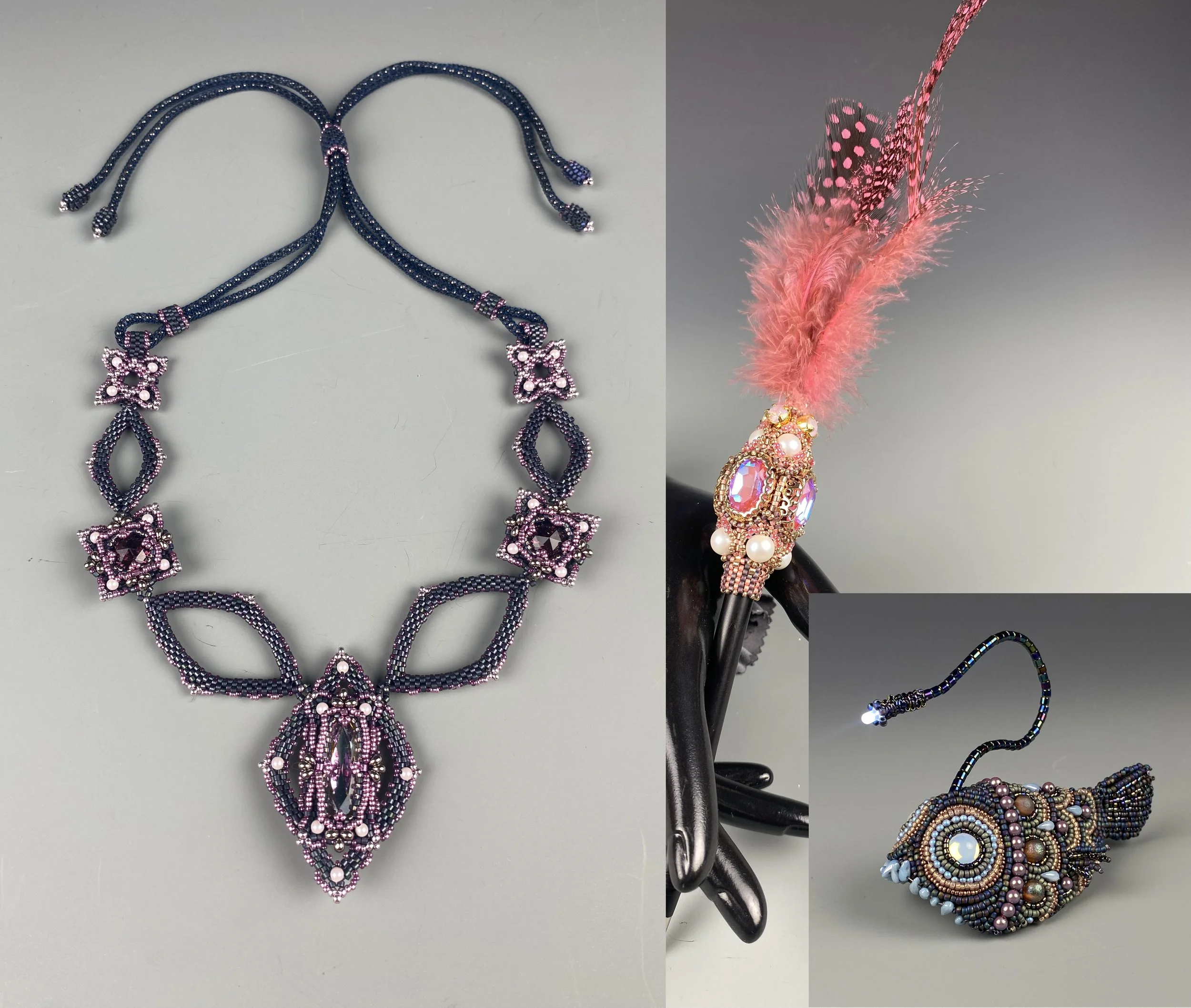 Join me for either in-person or virtual instruction and practice making unique beadwork designs. Each workshop is hosted by a different venue or organizer. In a workshop, you’ll learn the techniques necessary to complete the project, and will practice your new skills by stitching several parts of the project. You’ll be able to finish up after the workshop on your own time, by accessing online video demonstrations which show every step.